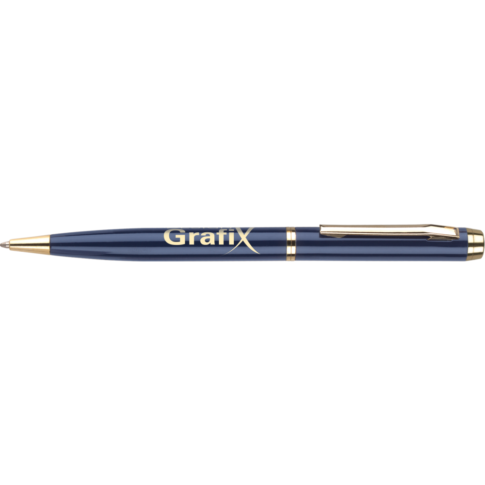 Twist-action retractable metal ballpen with quality refill. Available with matching rollerball.